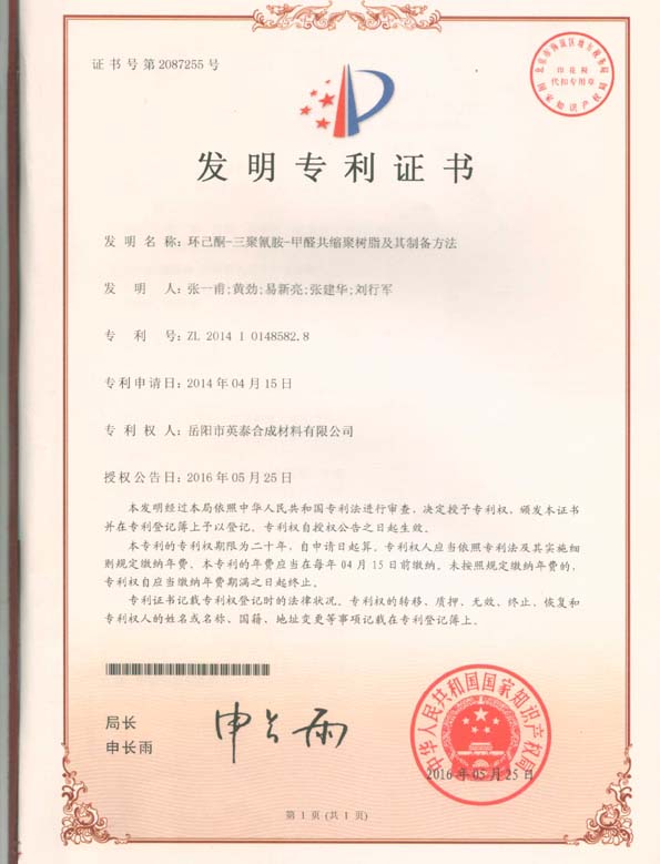 我司于2016年5月25日又榮獲一項國家發(fā)明專(zhuān)利“環(huán)己酮-三聚氰胺-甲醛共縮聚樹(shù)脂及其制備方法”。