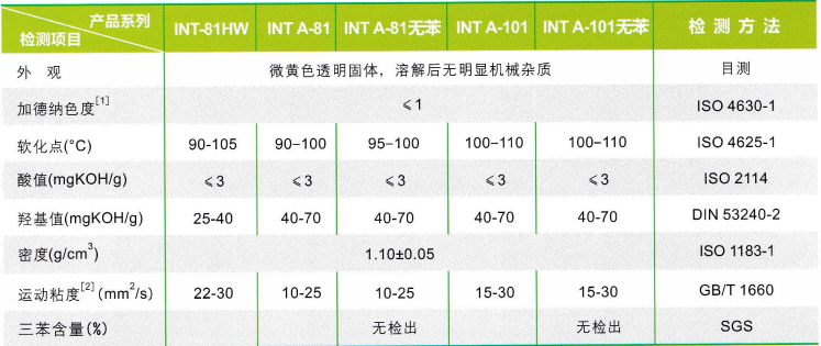 INT A-81無(wú)苯和INT A-101無(wú)苯不含苯、甲苯、二甲苯和酮類(lèi)等有機物,可應用于環(huán)保型涂料/油墨配方中。